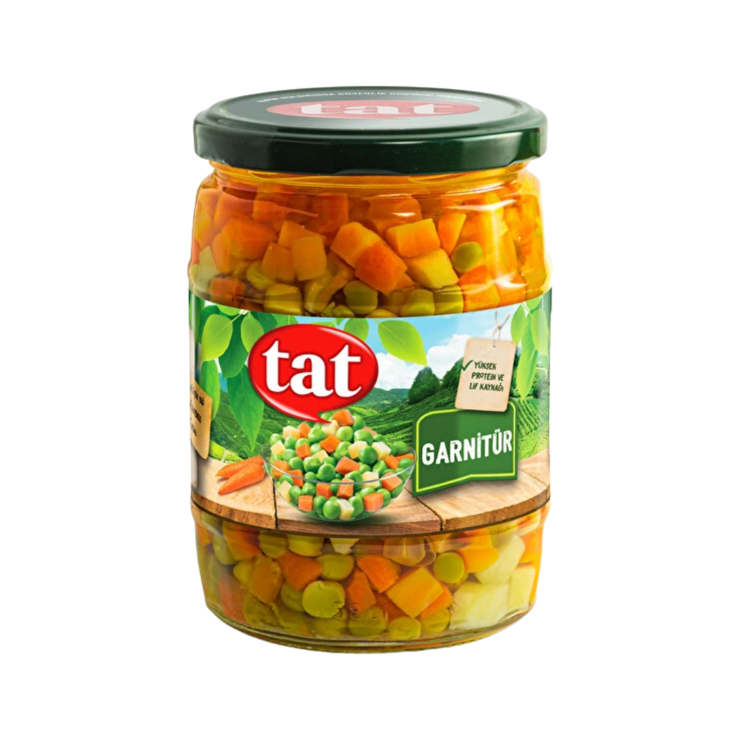 Su, bezelye (%45), havuç (%30), patates (%25), tuz ve asitlik düzenleyici (sitrik asit).Serin ve Kuru Ortamda Muhafaza Ediniz.Türk Gıda Kodeksine uygun üretilmiştir.